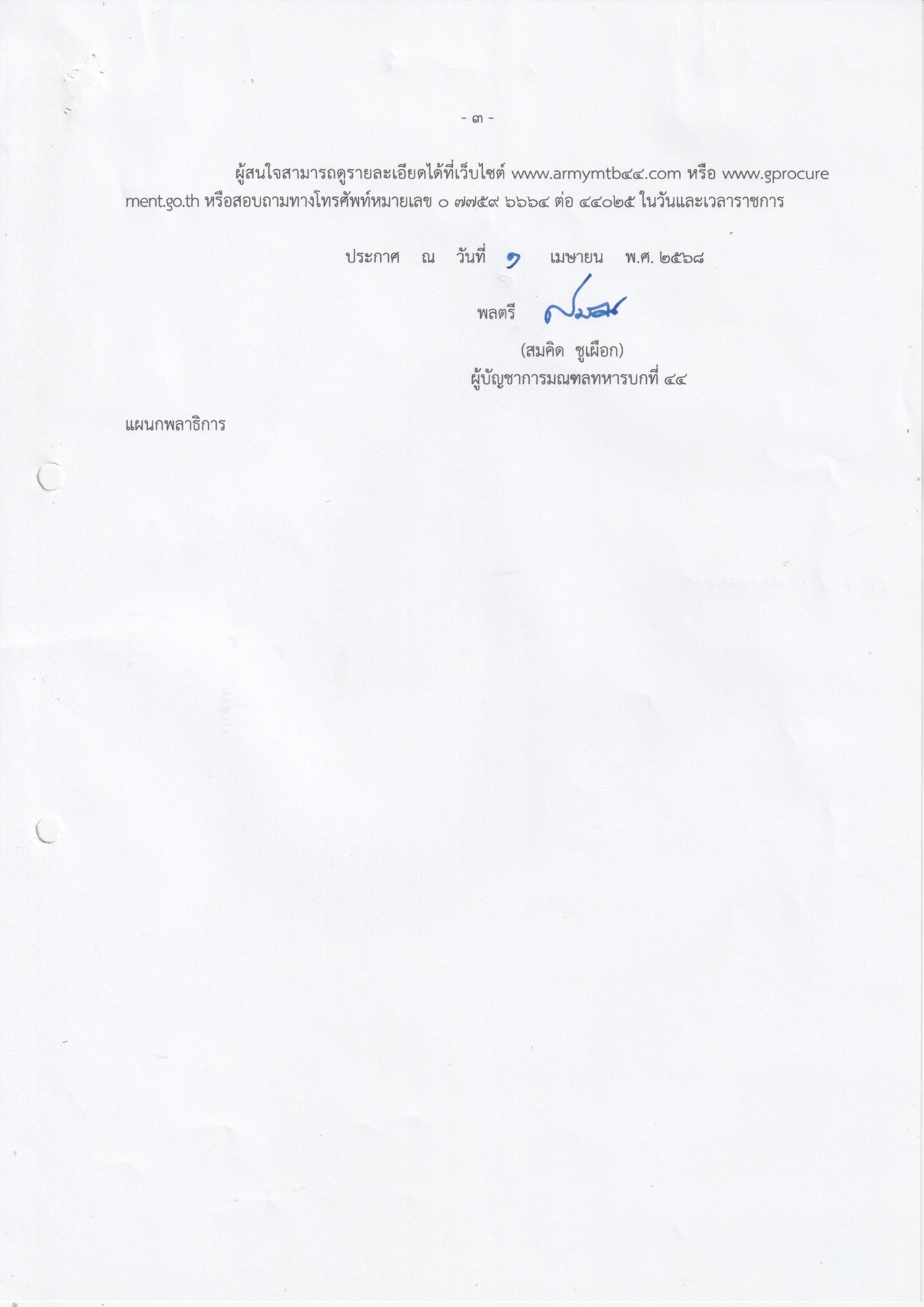 เรื่องประกวดราคาจ้างงานจ้างตัดเย็บเครื่องแบบสนามแบบกระเป๋าเจาะ พร้อมเครื่องหมายของทหารกองประจำการปีที่ ๑ (ผลัด ๑/๒๕๖๘) ของมณฑลทหารบกที่ ๔๔