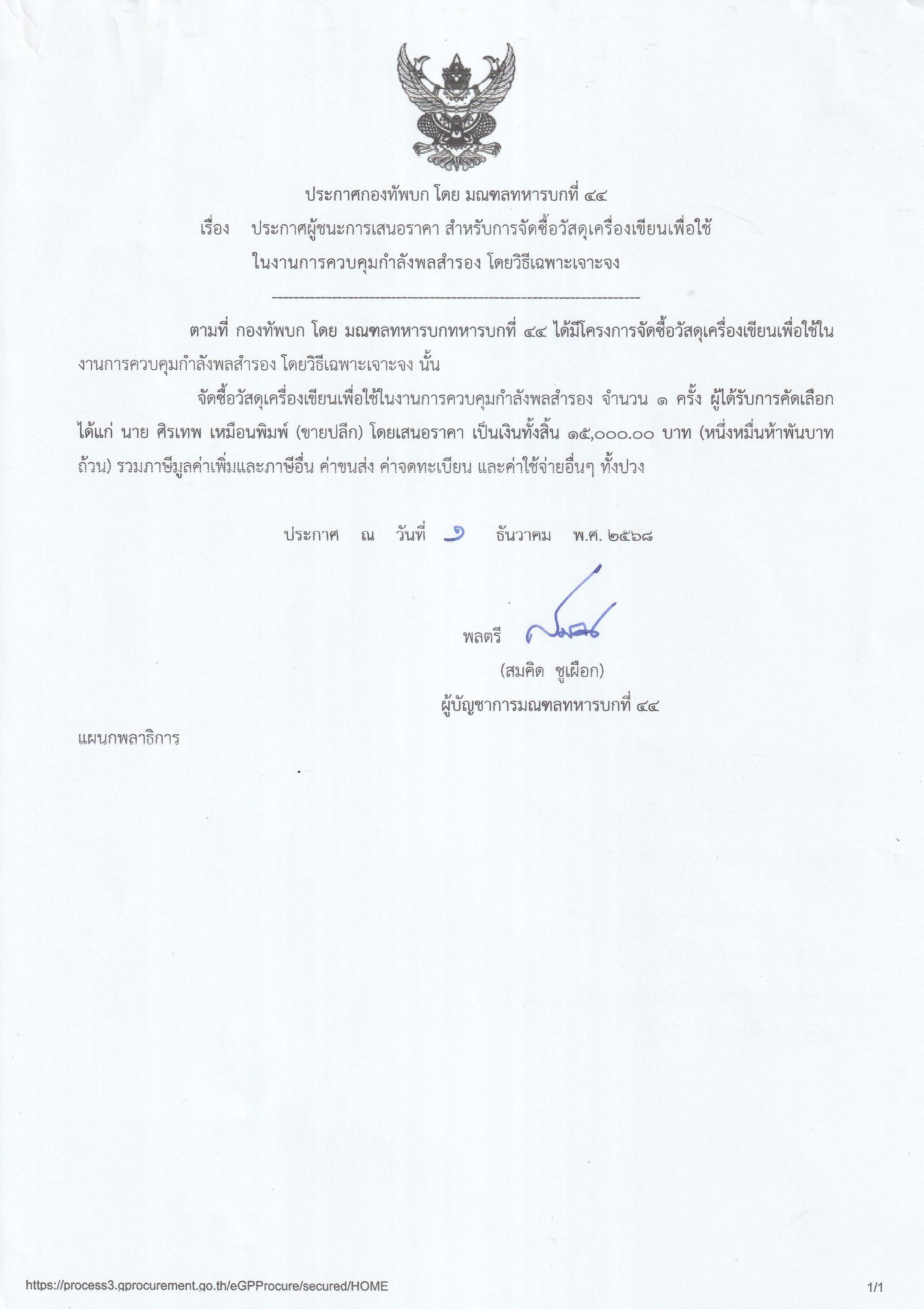 ประกาศผู้ชนะเสนอราคา จัดซื้อวัสดุเครื่องเขียนเพื่อใช้ในงานการควบคุมกำลังพลสำรอง โดยวิธีเฉพาะเจาะจง
