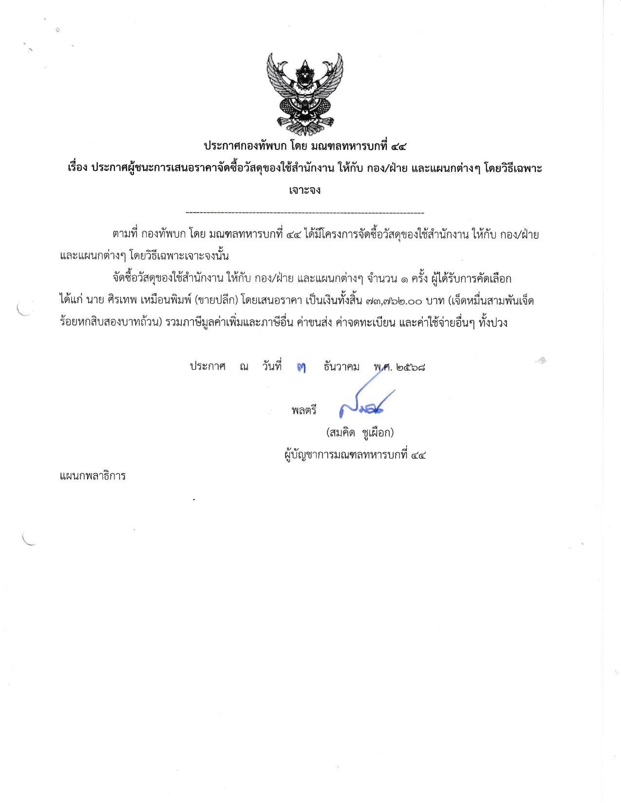 ประกาศผู้ชนะเสนอราคา จัดซื้อวัสดุของใช้สำนักงาน ให้กับ กอง แผนก ฝ่าย โดยวิธีเฉพาะเจาะจง