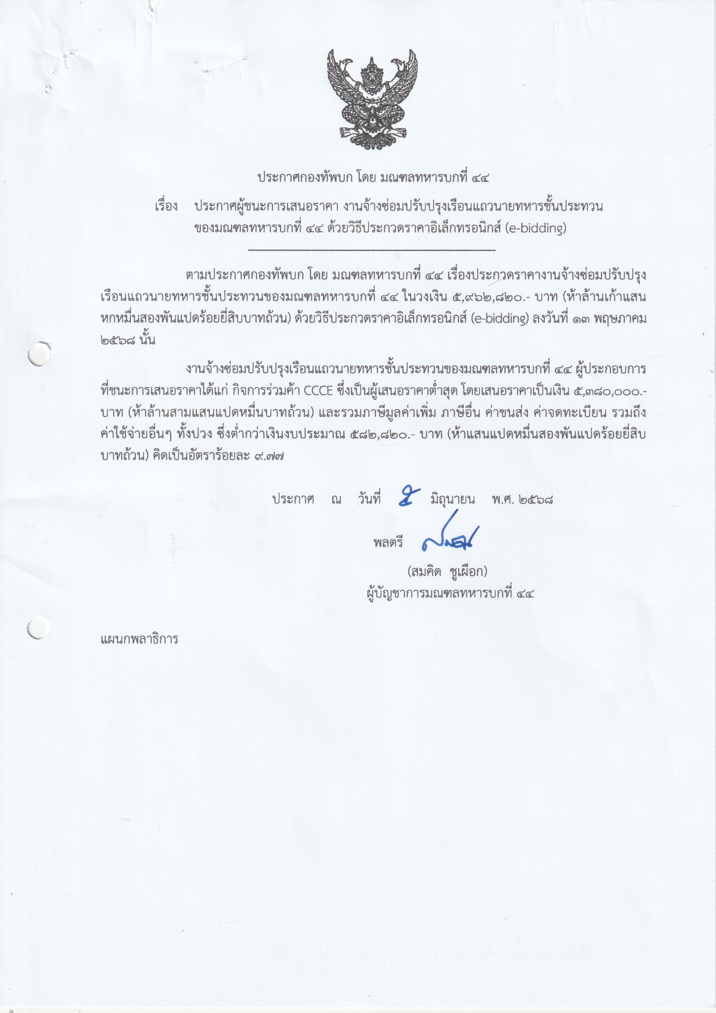 เรื่อง ประกาศผู้ชนะการเสนอราคา ประกวดราคางานจ้างซ่อมปรับปรุงเรือนแถวนายทหารชั้นประทวนของมณฑลทหารบกที่ ๔๔ ประจำปีงบประมาณ ๒๕๖๘