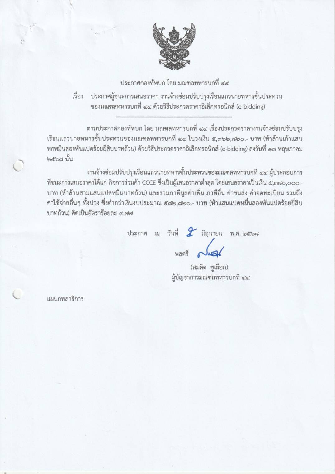 เรื่อง ประกาศผู้ชนะการเสนอราคา ประกวดราคางานจ้างซ่อมปรับปรุงโรงนอนทหารจุ ๙๐ คน อาคารหมายเลข ๒๐๐/๔๕ ของ ป.๕ พัน.๒๕