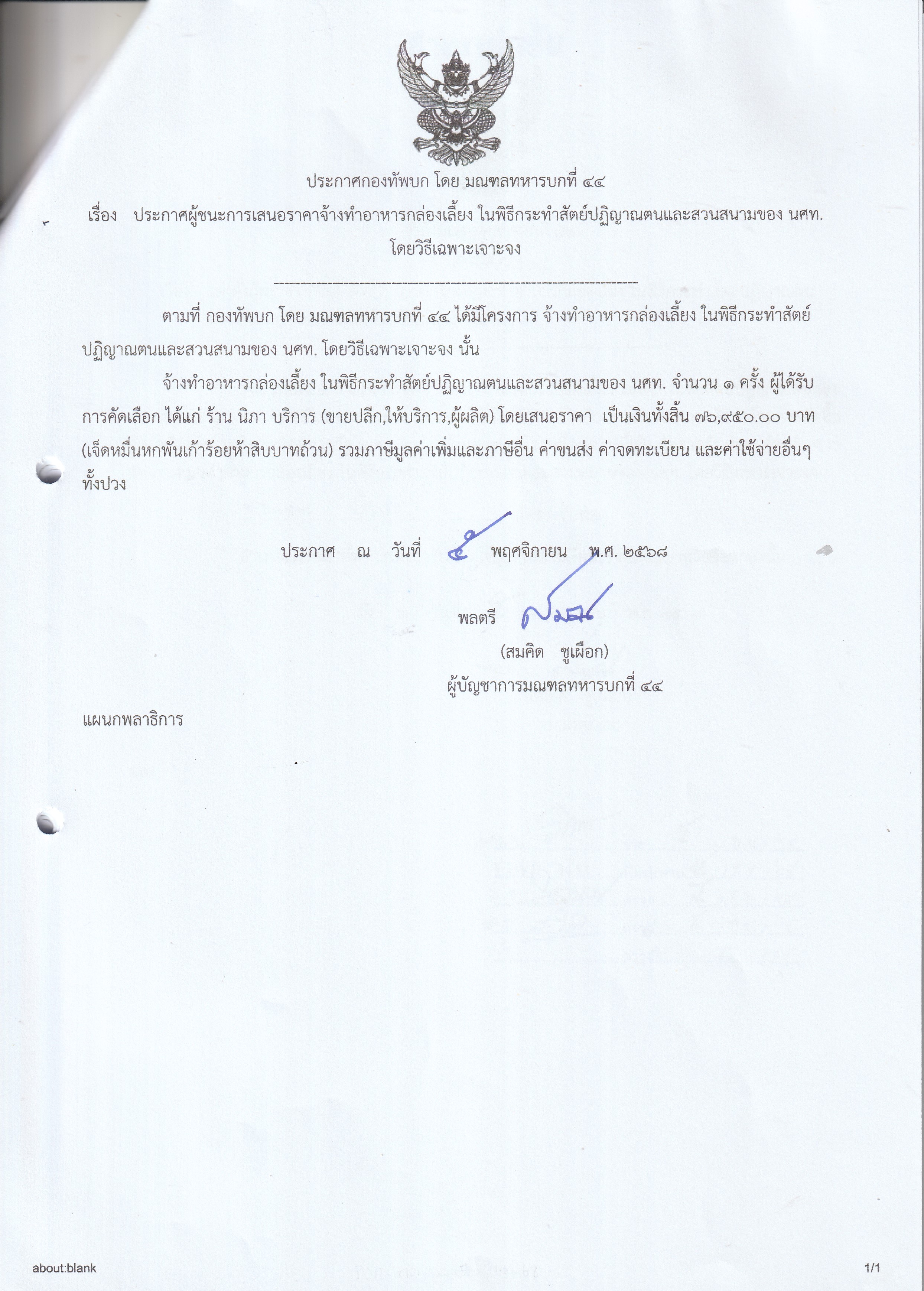 ประกาศผู้ชนะเสนอราคา จัดจ้างทำอาหารกล่องเลี้ยง ในพิธีกระทำสัตย์ปฏิญาณตนและสวนสนามของ นศท. โดยวิธีเฉพาะเจาะจง