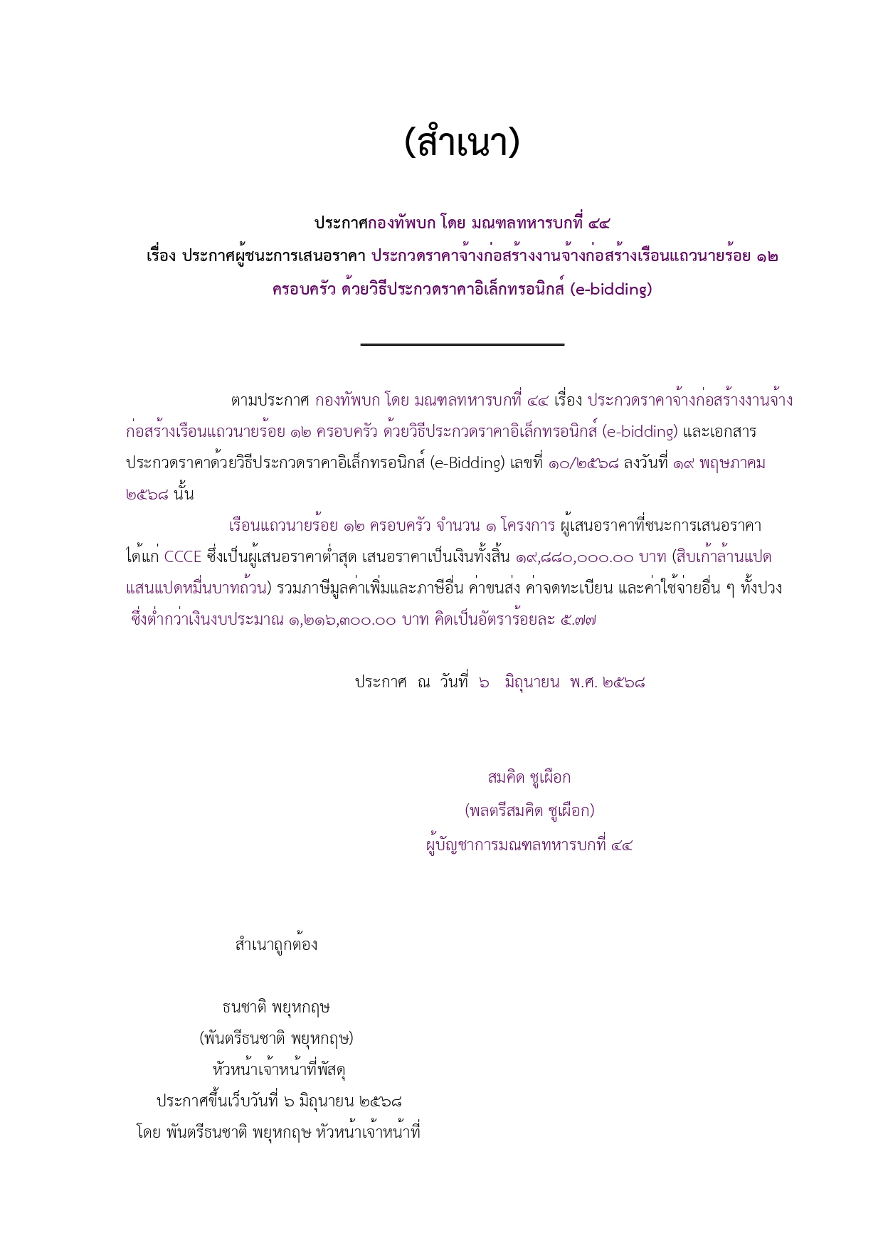 ประกาศผู้ชนะการเสนอราคา ประกวดราคาจ้างก่อสร้างงานจ้างก่อสร้างเรือนแถวนายร้อย ๑๒ ครอบครัว