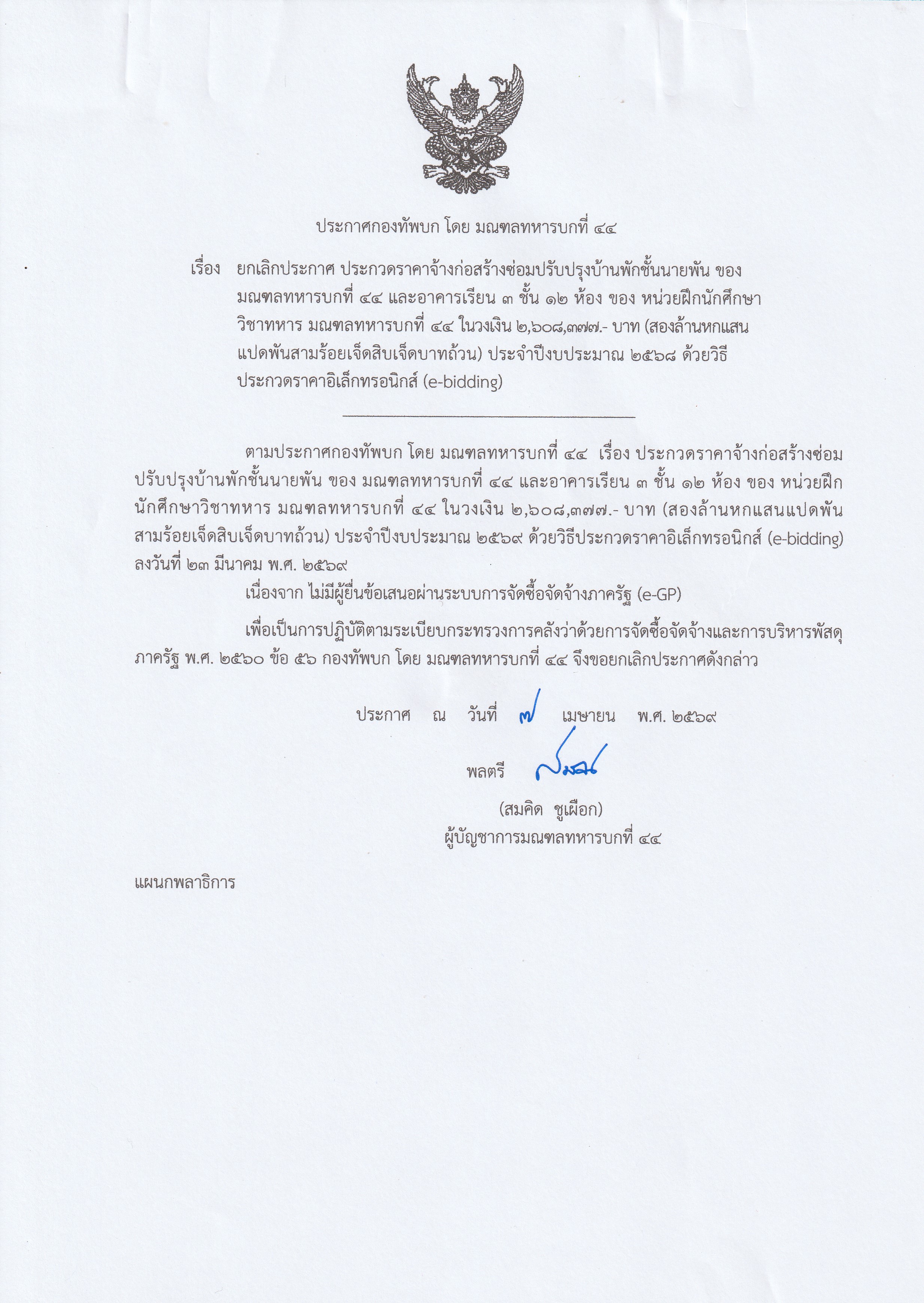 เรื่อง ประกาศยกเลิกประกาศ ประกวดราคาจ้างก่อสร้างซ่อมปรับปรุงบ้านพักชั้นนายพัน ของ มทบ.๔๔ และอาคารเรียน ๓ ชั้น ๑๒ ห้อง ของ นฝ.นศท.มทบ.44 ด้วยวิธีประกวดราคาอิเล็กทรอนิกส์ (e-bidding)