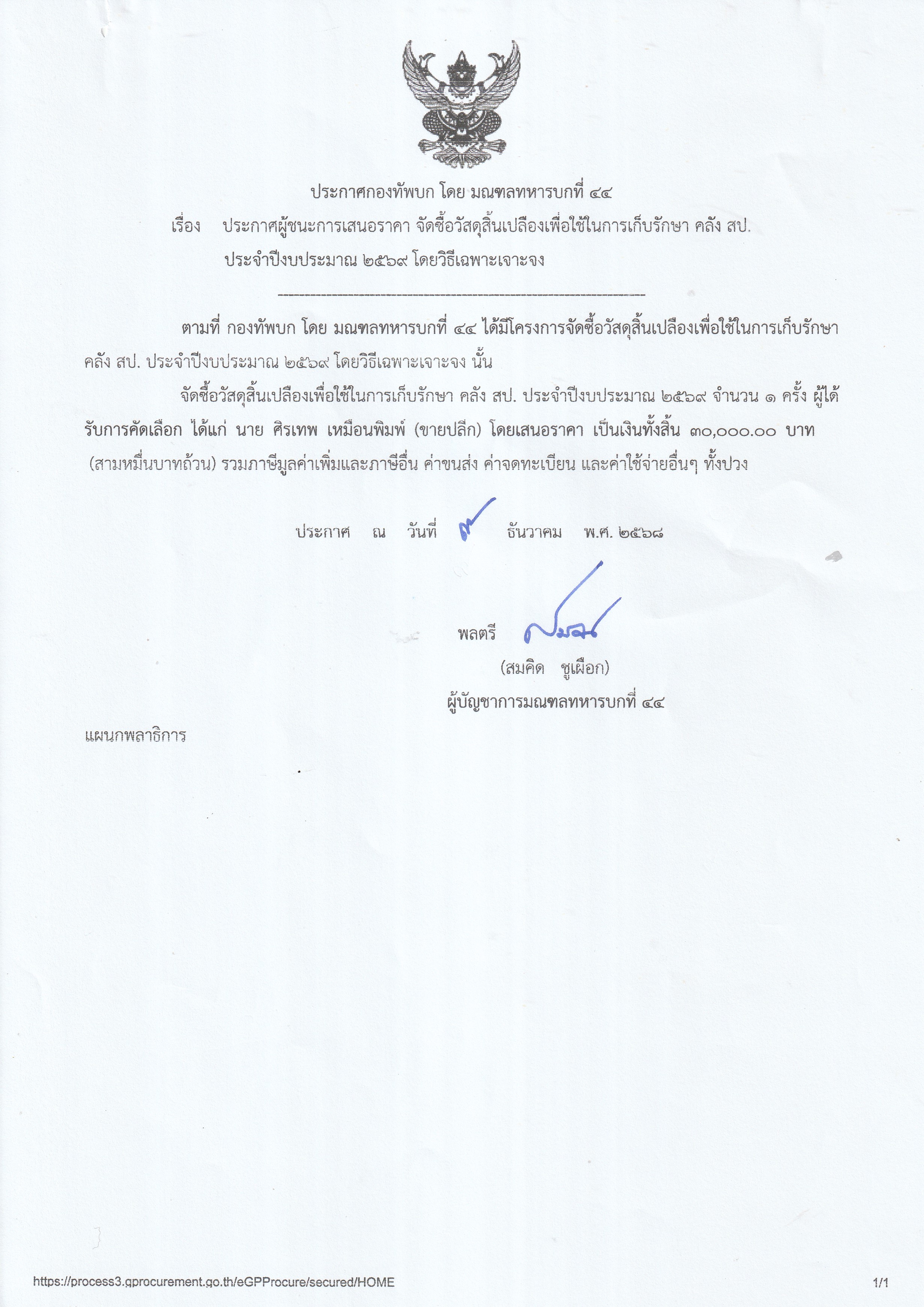 ประกาศผู้ชนะเสนอราคา จัดซื้อวัสดุสิ้นเปลืองเพื่อใช้นการเก็บรักษา คลัง สป. ประจำปีงบประมาณ ๒๕๖๙ โดยวิธีเฉพาะเจาะจง