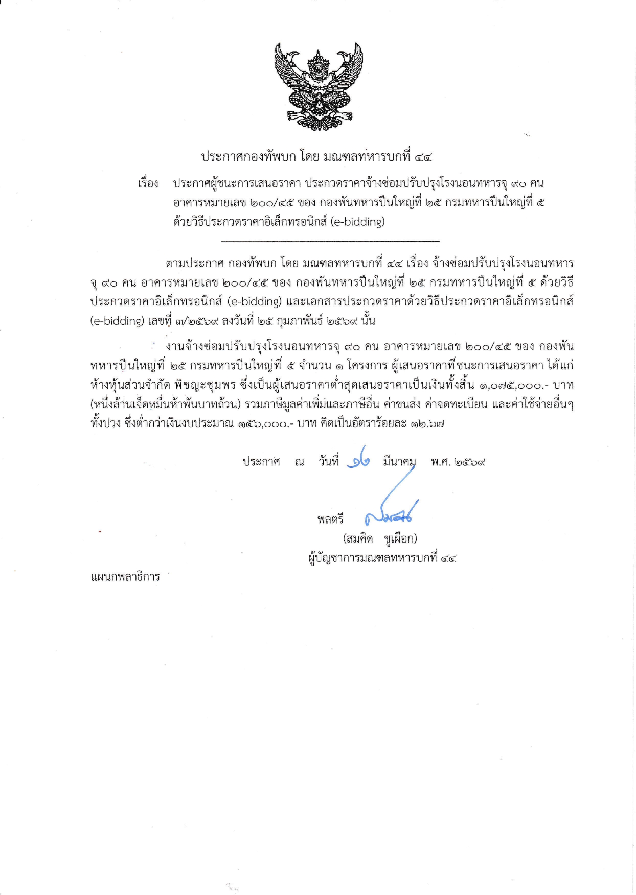 ประกาศผู้ชนะการเสนอราคา ประกวดราคางานจ้างซ่อมปรับปรุงโรงนอนทหารจุ ๙๐ คน อาคารหมายเลข ๒๐๐/๔๕ ของ ป.๕ พัน.๒๕
