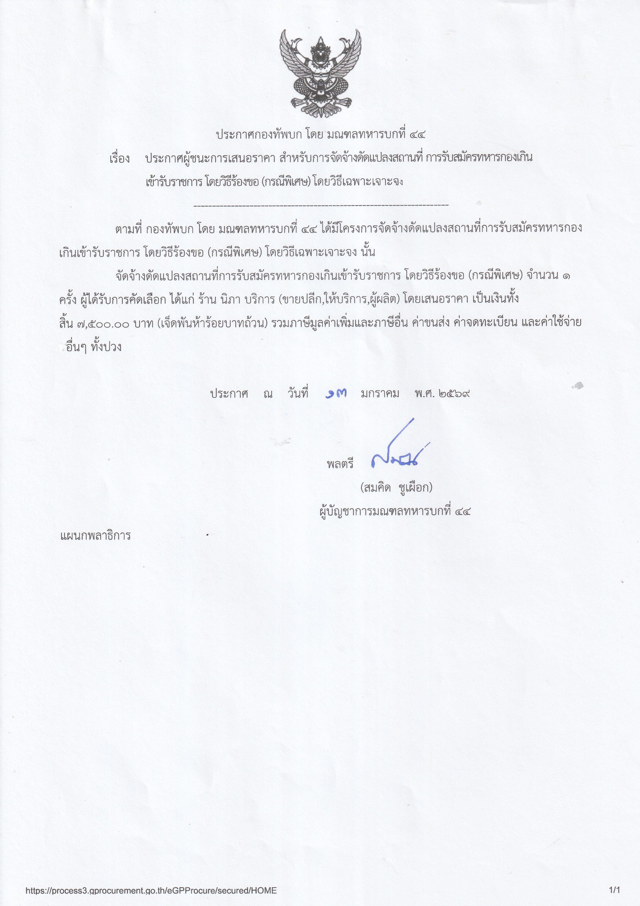 ประกาศผู้ชนะเสนอราคา จัดจ้างดัดแปลงสถานที่การรับสมัครทหารกองเกินเข้ารับราชการ โดยวิธีร้องขอ (กรณีพิเศษ) โดยวิธีเฉพาะเจาะจง