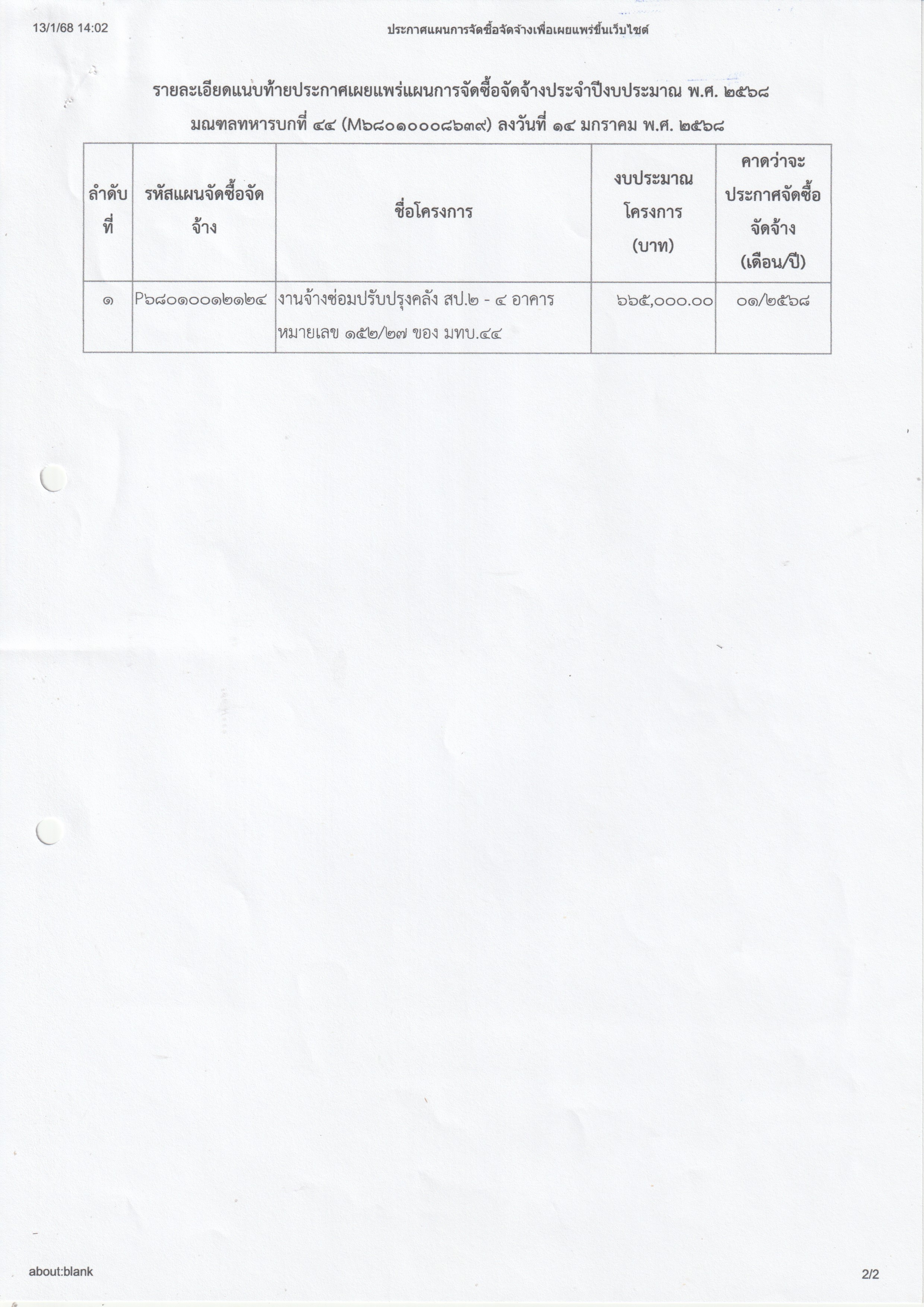เผยแพร่แผนการจัดซื้อจัดจ้าง ประจำปีงบประมาณ พ.ศ. ๒๕๖๙ งานจ้างซ่อมปรับปรุงคลังสิ่งอุปกรณ์ประเภท 2 และ 4 อาคารหมายเลข 152/27 ของมณฑลทหารบกที่ 44