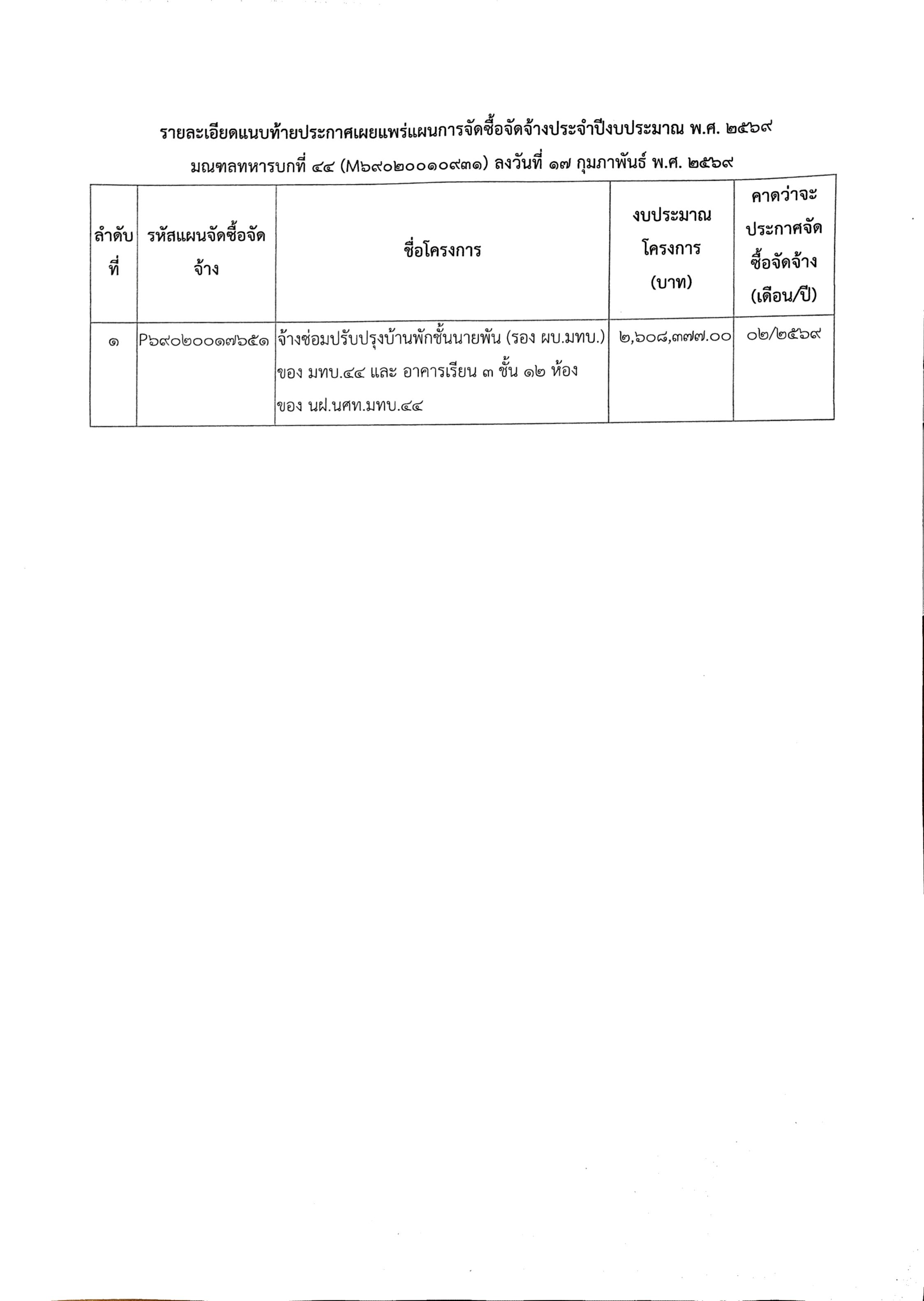 เผยแพร่แผนการจัดซื้อจัดจ้าง ประจำปีงบประมาณ พ.ศ. ๒๕๖๙ งานจ้างซ่อมปรับปรุงบ้านพักชั้นนายพัน (รอง ผบ.มทบ.) ของ มทบ.๔๔ และ อาคารเรียน ๓ ชั้น ๑๒ ห้อง ของ นฝ.นศท.มทบ.๔๔