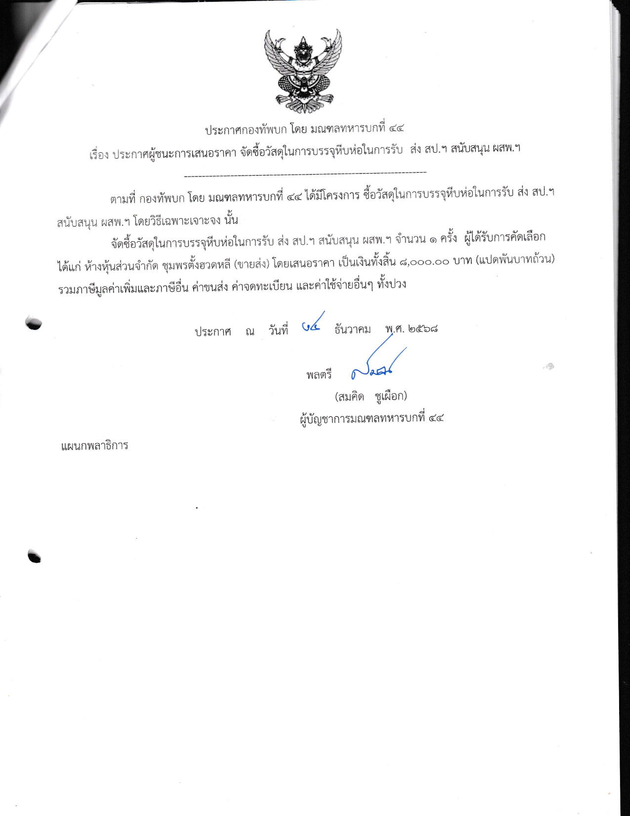 ประกาศผู้ชนะเสนอราคา จัดซื้อวัสดุในการบรจุหีบห่อในการรับ ส่ง สป.ฯ สนับสนุน ผสพ.ฯ โดยวิธีเฉพาะเจาะจง