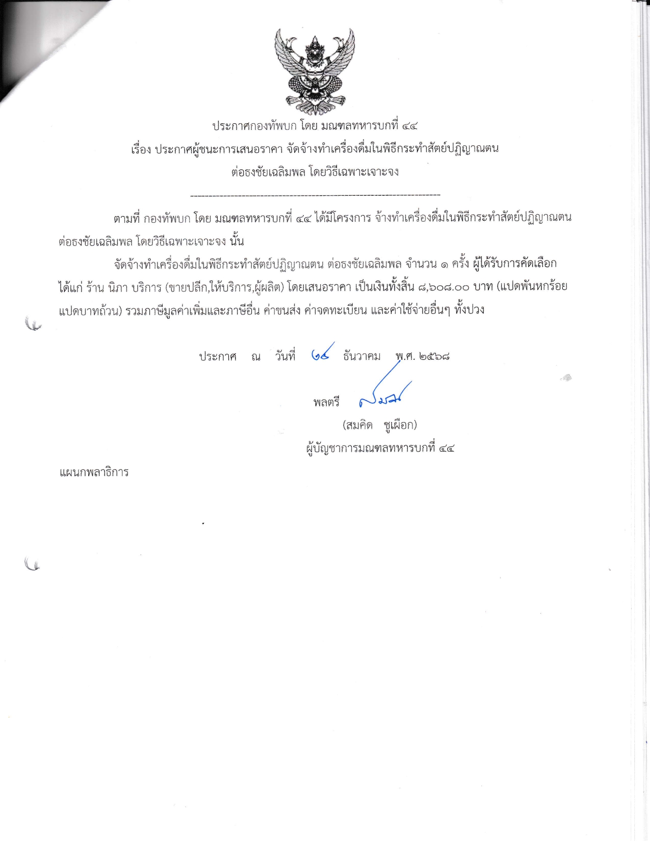 ประกาศผู้ชนะเสนอราคา จัดจ้างทำเครื่องดื่มในพิธีกระทำสัตย์ปฏิญาณตนต่อธงชัยเฉลิมพล โดยวิธีเฉพาะเจาะจง