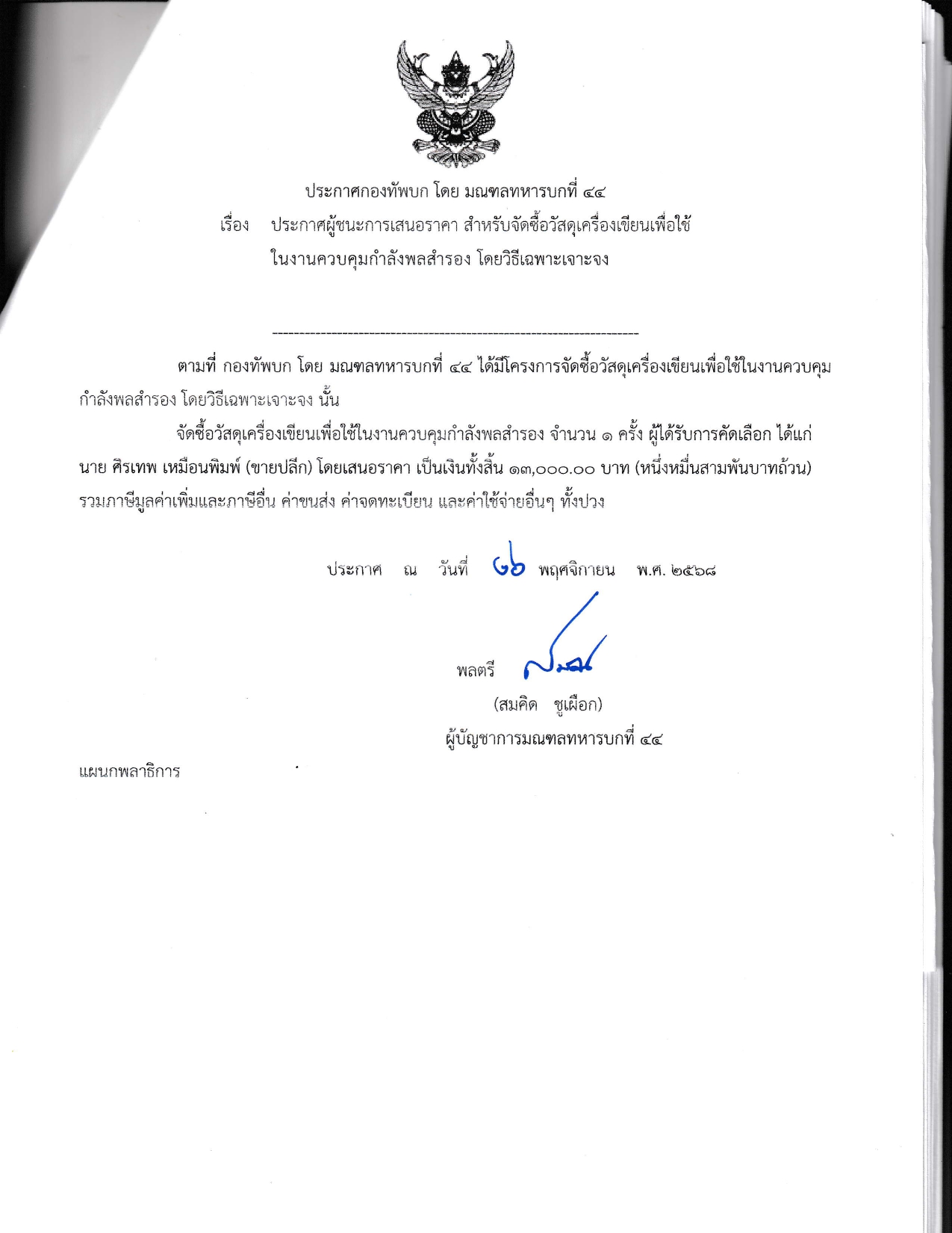 ประกาศผู้ชนะเสนอราคา จัดซื้อวัสดุเครื่องเขียนเพื่อใช้ในงานควบคุมกำลังพลสำรอง โดยวิธีเฉพาะเจาะจง