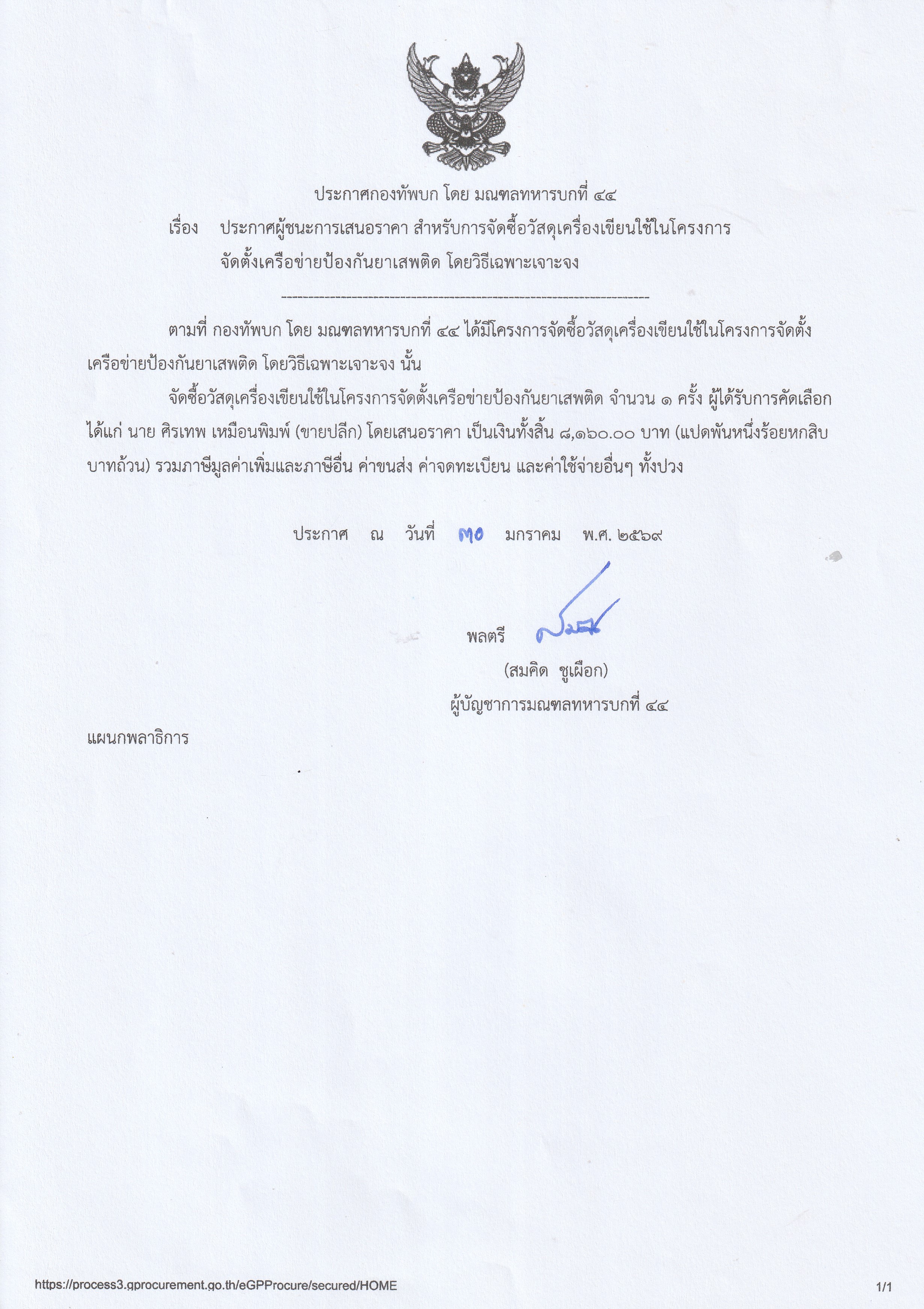 ประกาศผู้ชนะเสนอราคา จัดซื้อวัสดุเครื่องเขียนใช้ในโครงการจัดตั้งเครือข่ายป้องกันยาเสพติด โดยวิธีเฉพาะเจาะจง