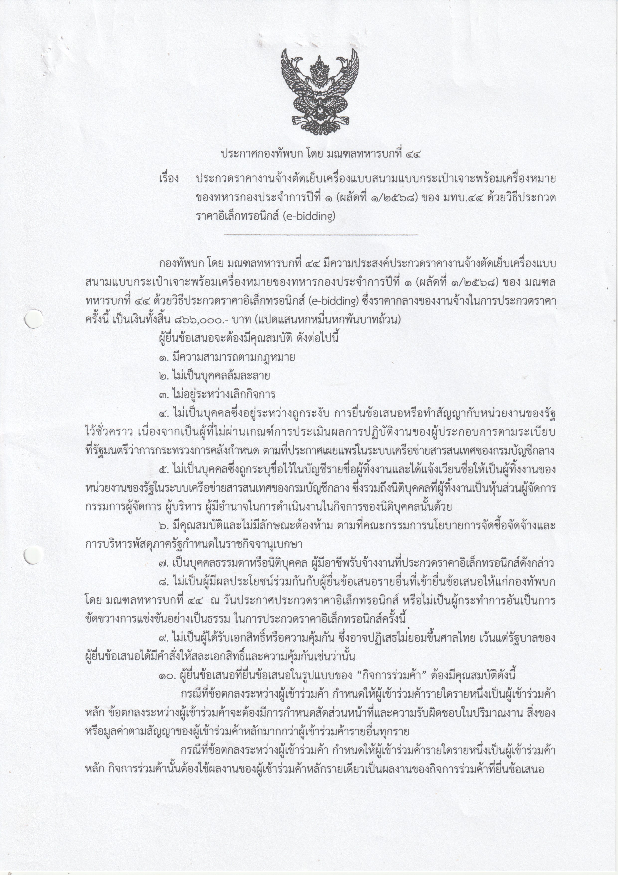 เรื่องประกวดราคาจ้างงานจ้างตัดเย็บเครื่องแบบสนามแบบกระเป๋าเจาะ พร้อมเครื่องหมายของทหารกองประจำการปีที่ ๑ (ผลัด ๑/๒๕๖๘) ของมณฑลทหารบกที่ ๔๔
