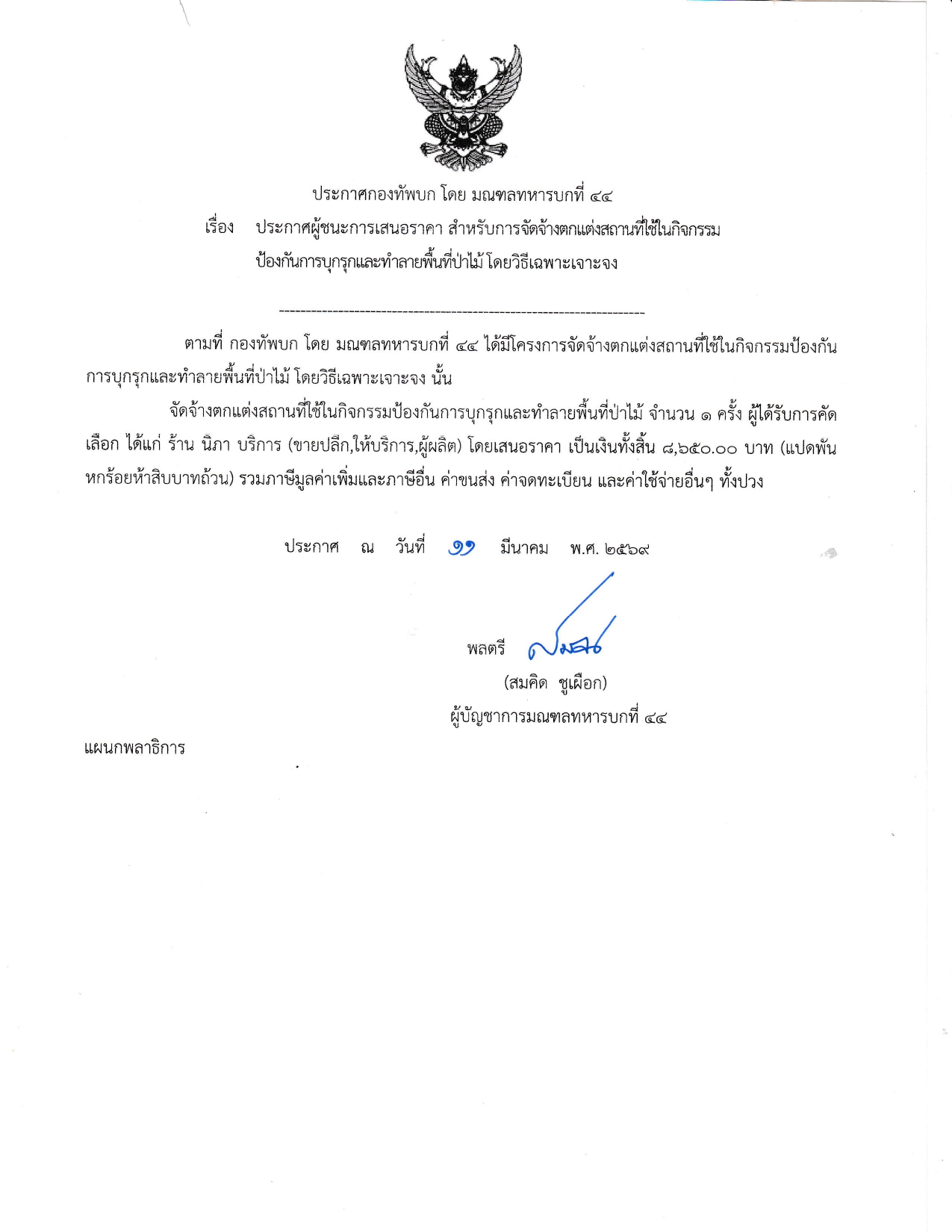 ประกาศผู้ชนะเสนอราคา จัดจ้างตกแต่งสถานที่ใช้ในกิจกรรมป้องกันการบุกรุกและทำลายพื้นที่ป่าไม้ โดยวิธีเฉพาะเจาะจง