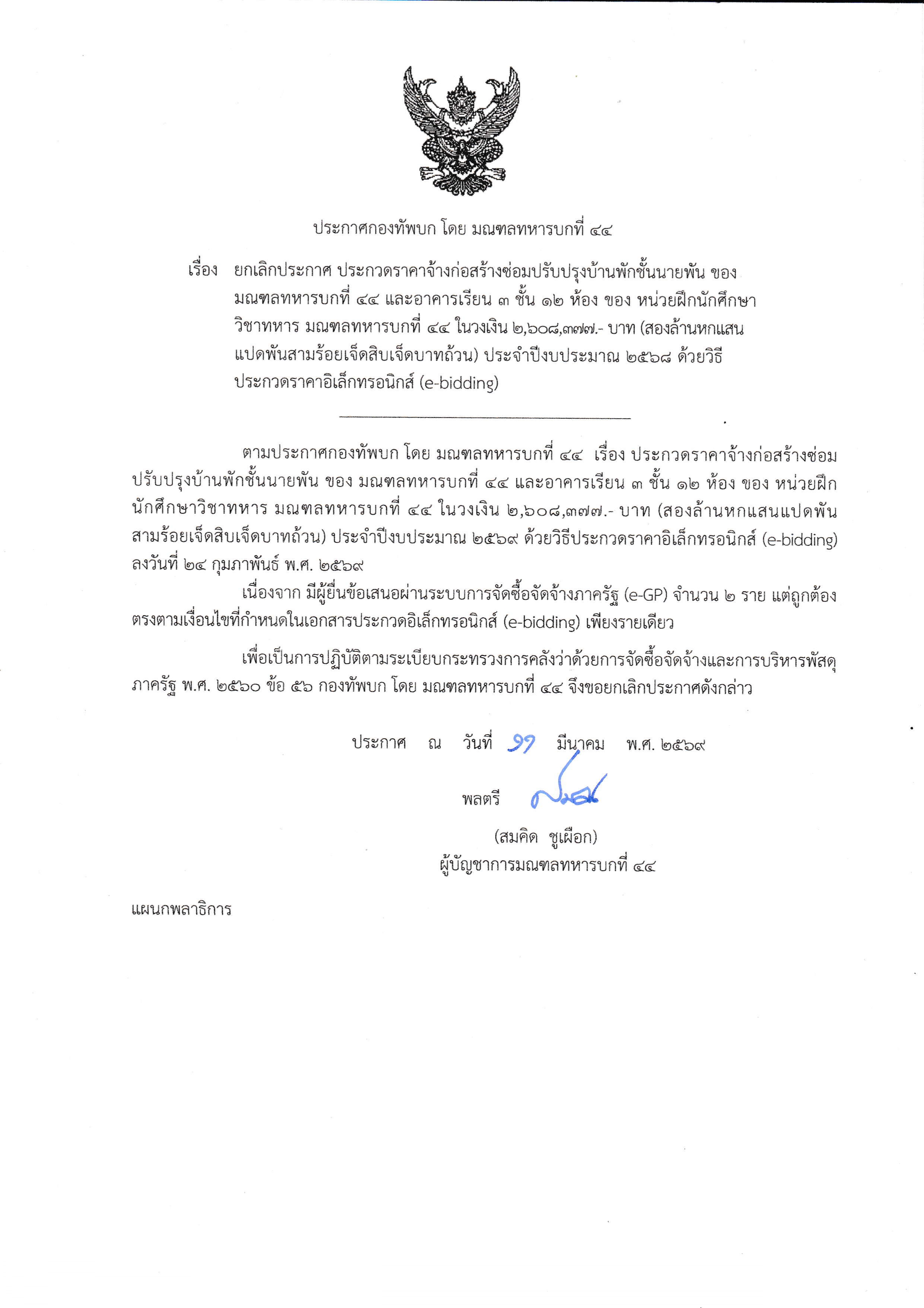 เรื่อง ประกาศยกเลิกประกาศ ประกวดราคาจ้างก่อสร้างซ่อมปรับปรุงบ้านพักชั้นนายพัน ของ มทบ.๔๔ และอาคารเรียน ๓ ชั้น ๑๒ ห้อง ของ นฝ.นศท.มทบ.44 ด้วยวิธีประกวดราคาอิเล็กทรอนิกส์ (e-bidding)