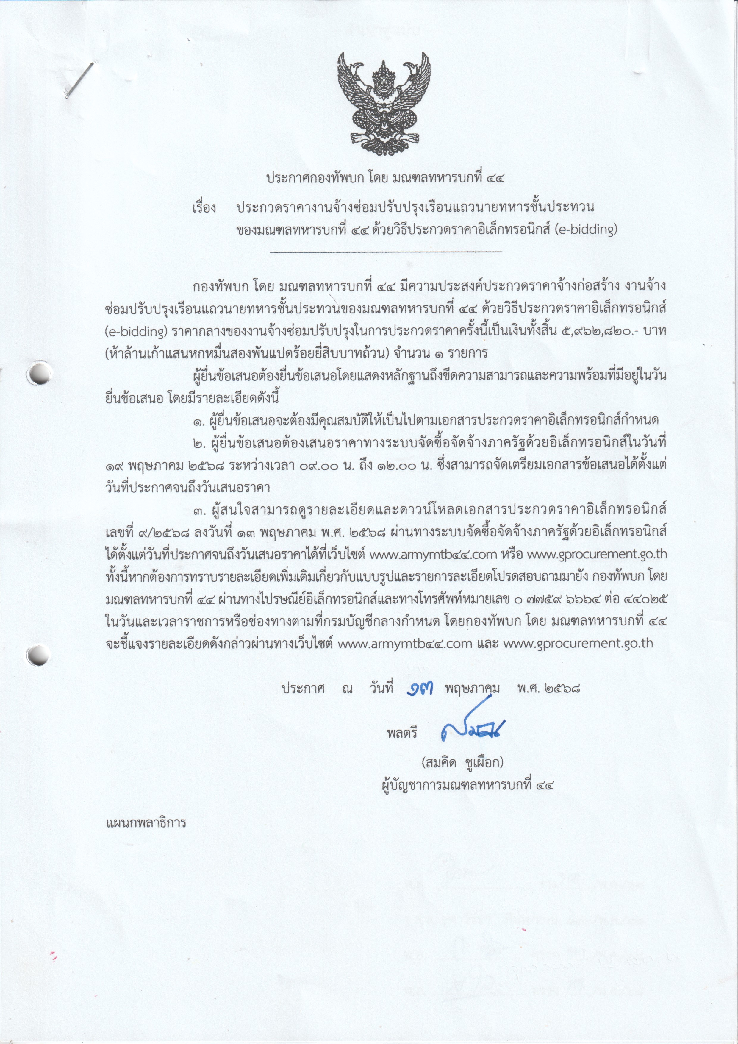 เรื่อง ประกวดราคางานจ้างซ่อมปรับปรุงเรือนแถวนายทหารชั้นประทวนของมณฑลทหารบกที่ ๔๔ ประจำปีงบประมาณ ๒๕๖๘