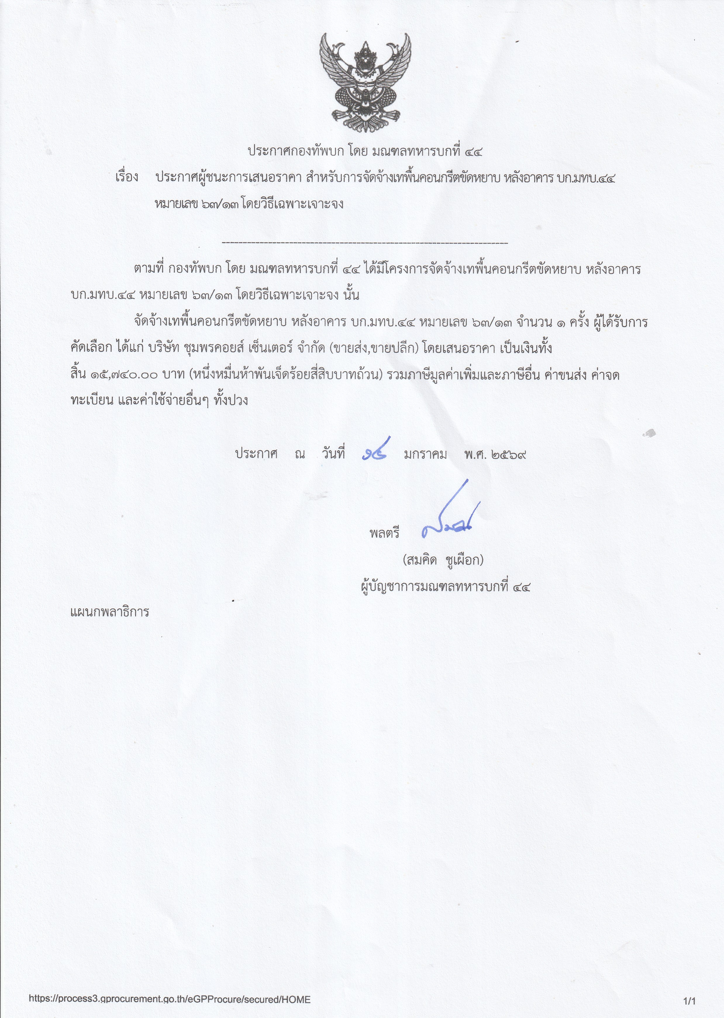 ประกาศผู้ชนะเสนอราคา จัดจ้างเทพื้นคอนกรีตขัดหยาบ หลังอาคาร บก.มทบ.๔๔ หมายเลข ๖๓/๑๓ โดยวิธีเฉพาะเจาะจง