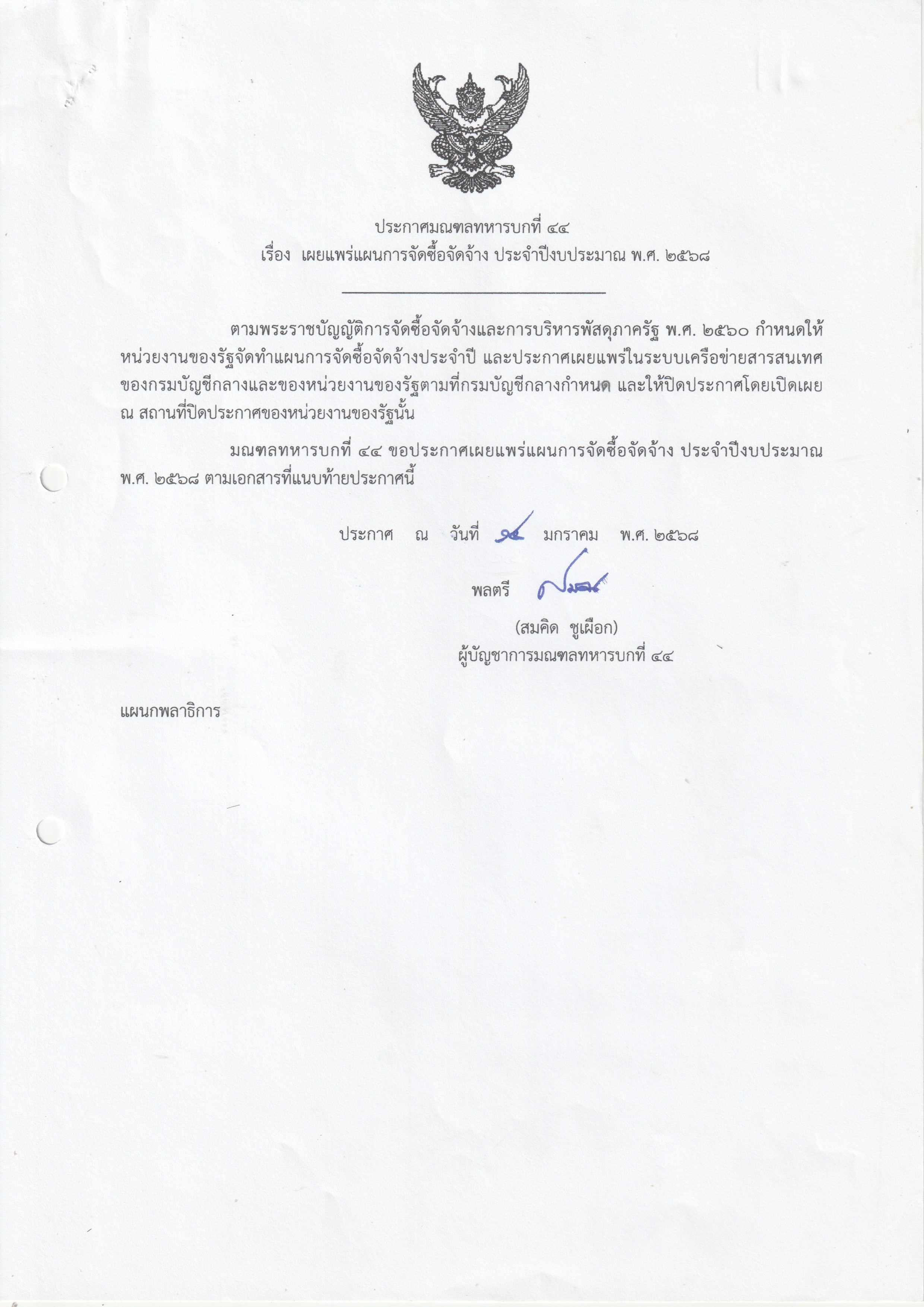 เผยแพร่แผนการจัดซื้อจัดจ้าง ประจำปีงบประมาณ พ.ศ. ๒๕๖๙ งานจ้างซ่อมปรับปรุงคลังสิ่งอุปกรณ์ประเภท 2 และ 4 อาคารหมายเลข 152/27 ของมณฑลทหารบกที่ 44