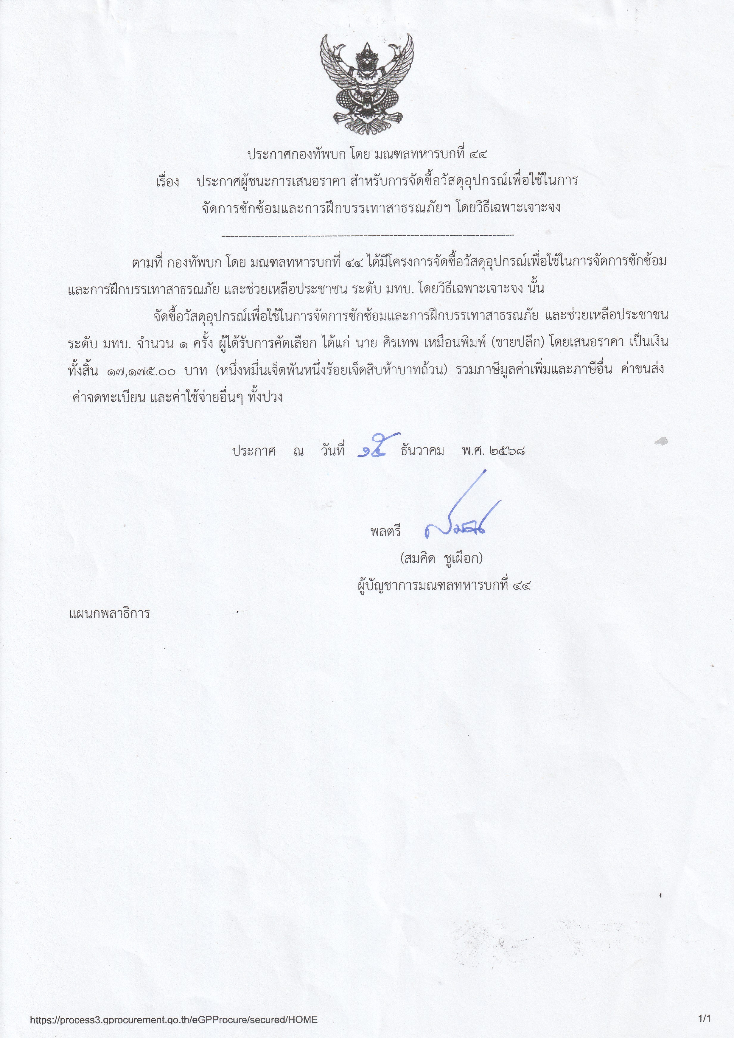 ประกาศผู้ชนะเสนอราคา จัดซื้อวัสดุอุปกรณ์เพื่อใช้ในการจัดการซักซ้อมและบรรเทาสาธารณภัยฯ โดยวิธีเฉพาะเจาะจง