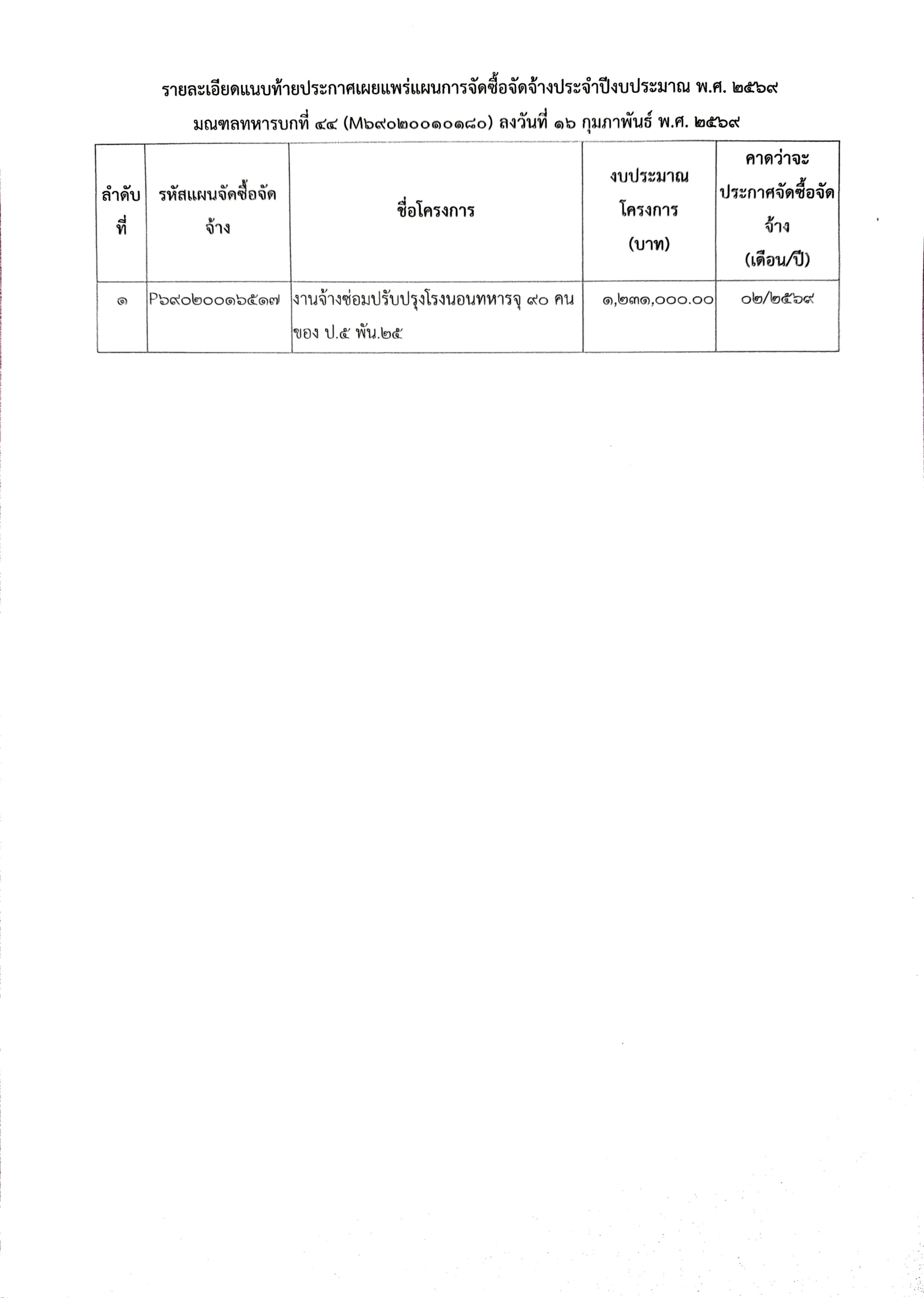 เผยแพร่แผนการจัดซื้อจัดจ้าง ประจำปีงบประมาณ พ.ศ. ๒๕๖๙ งานจ้างซ่อมแซมปรับปรุงโรงนอนทหารจุ ๙๐ คน ของ ป.๕ พัน.๒๕