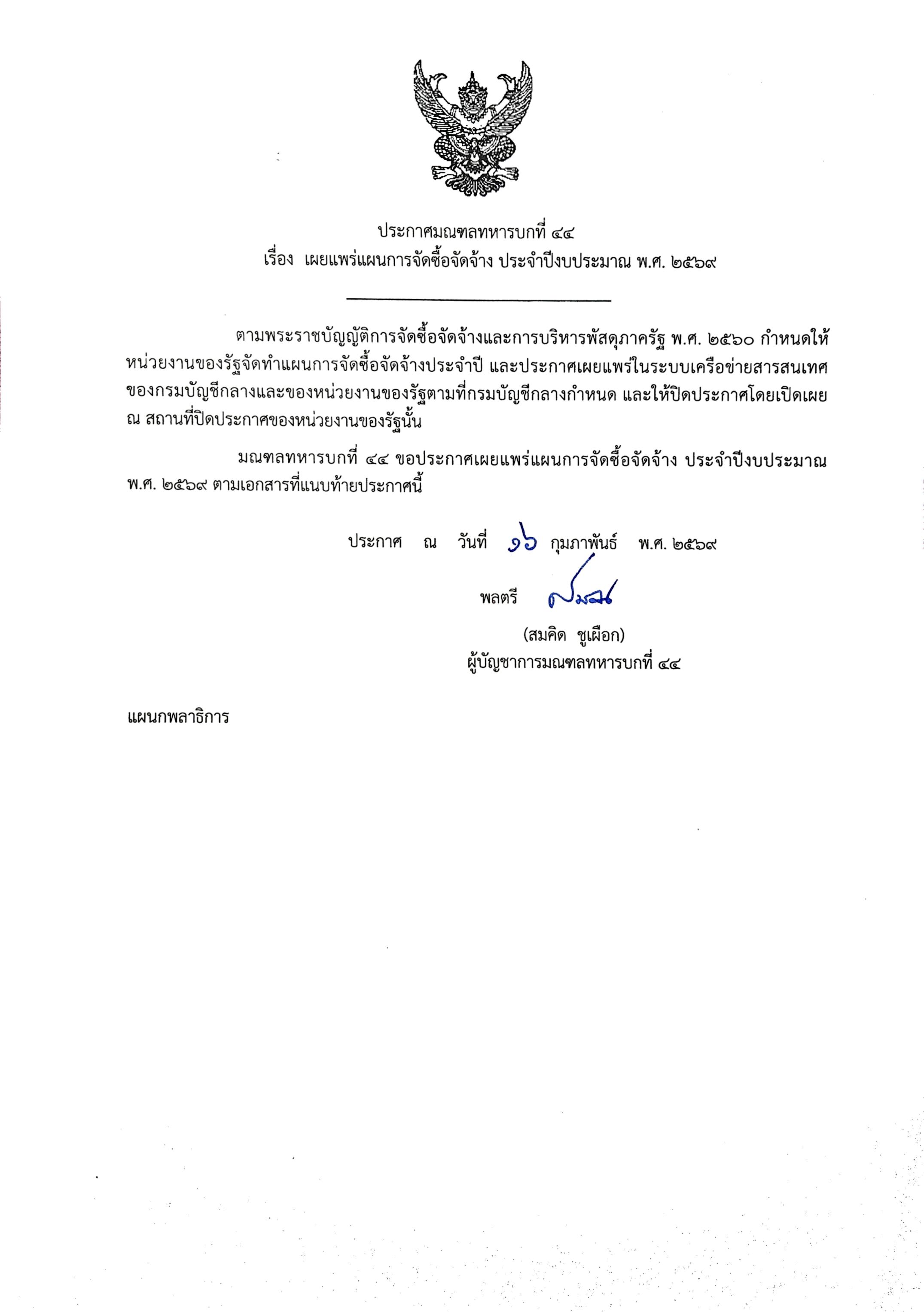 เรื่อง เผยแพร่แผนการจัดซื้อจัดจ้าง ประจำปีงบประมาณ พ.ศ. ๒๕๖๙