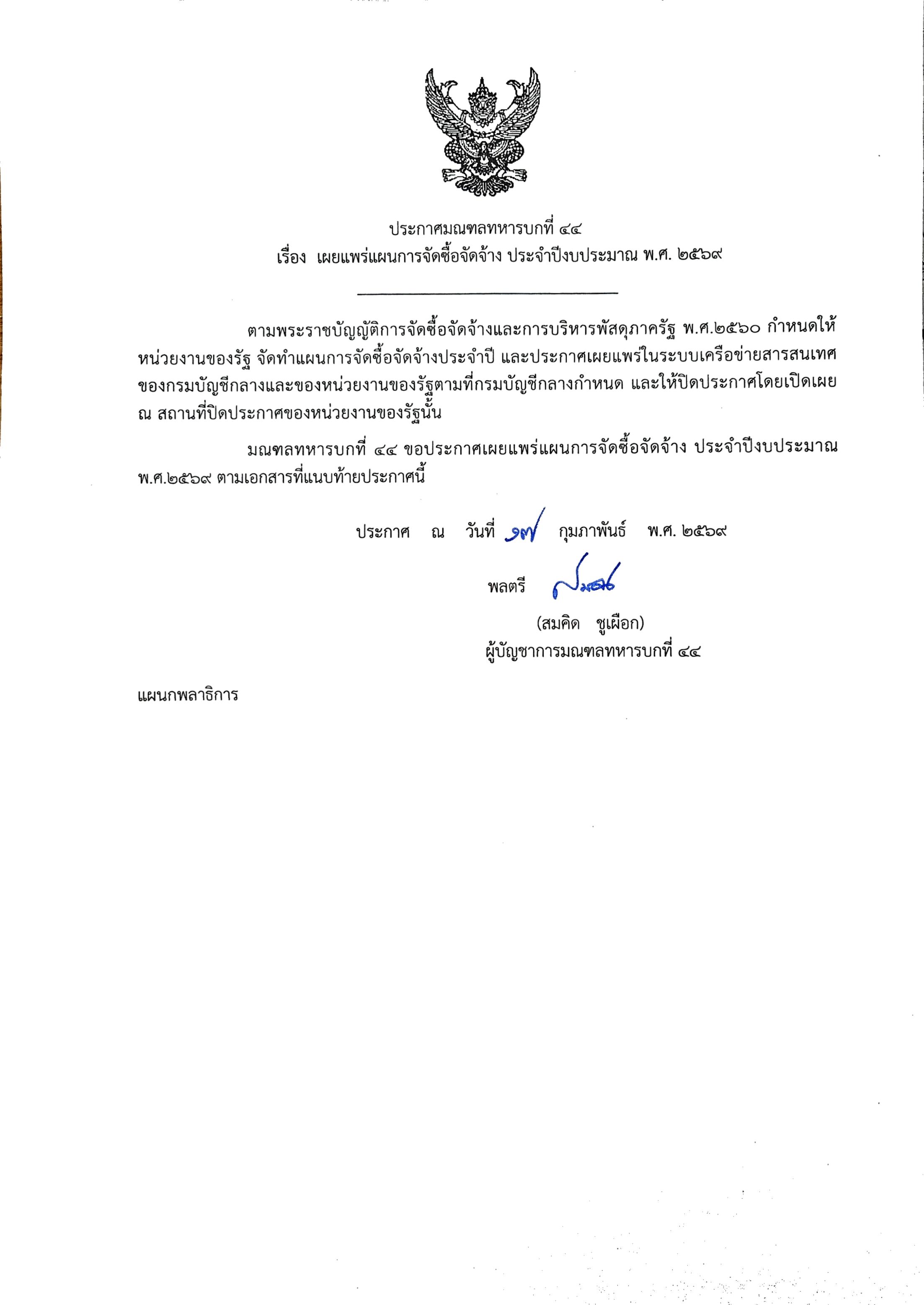เผยแพร่แผนการจัดซื้อจัดจ้าง ประจำปีงบประมาณ พ.ศ. ๒๕๖๙ งานจ้างซ่อมปรับปรุงบ้านพักชั้นนายพัน (รอง ผบ.มทบ.) ของ มทบ.๔๔ และ อาคารเรียน ๓ ชั้น ๑๒ ห้อง ของ นฝ.นศท.มทบ.๔๔