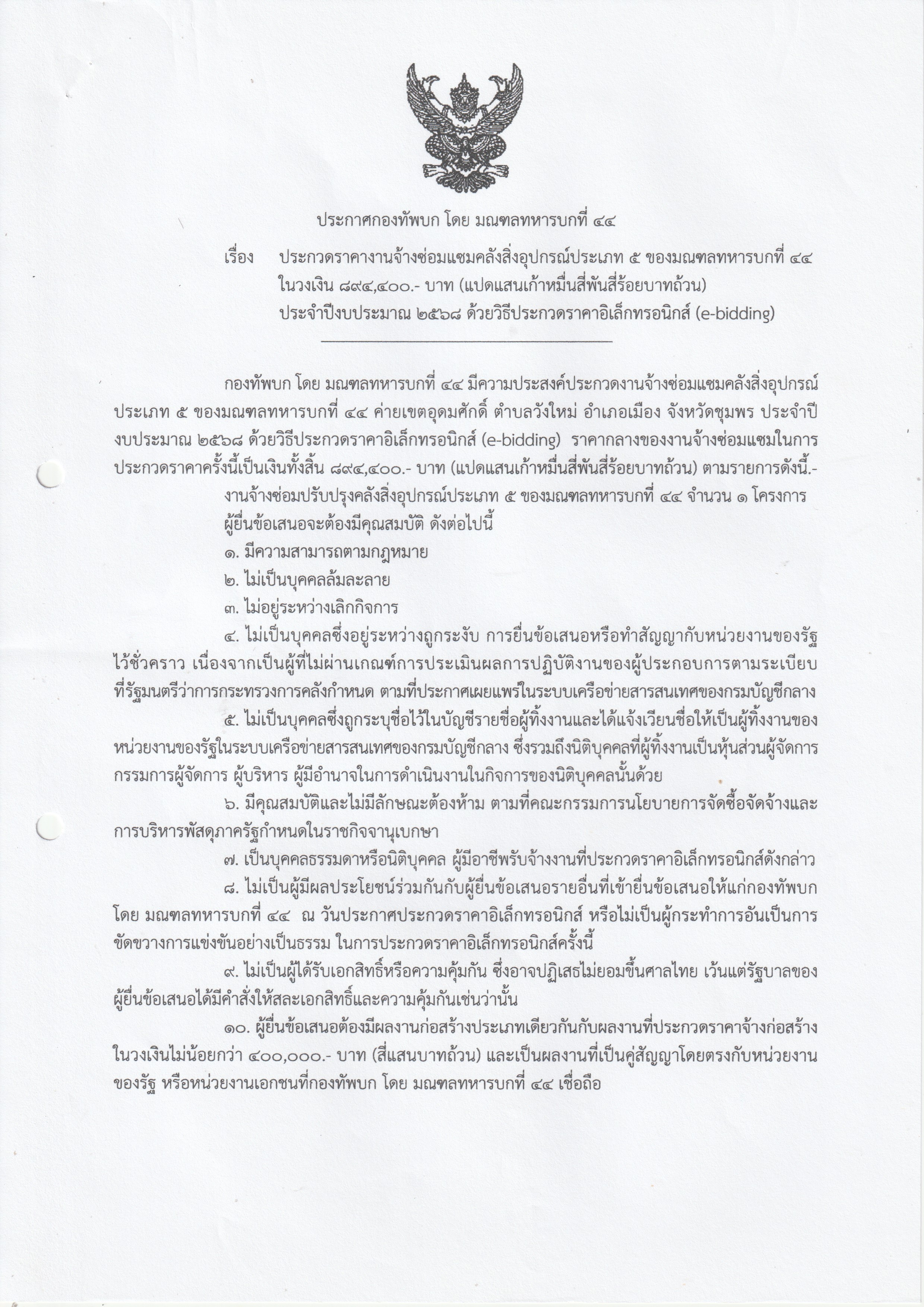 เรื่อง ประกวดราคาจ้างงานจ้างซ่อมแซมคลังสิ่งอุปกรณ์ประเภท ๕ ของมณฑลทหารบกที่ ๔๔