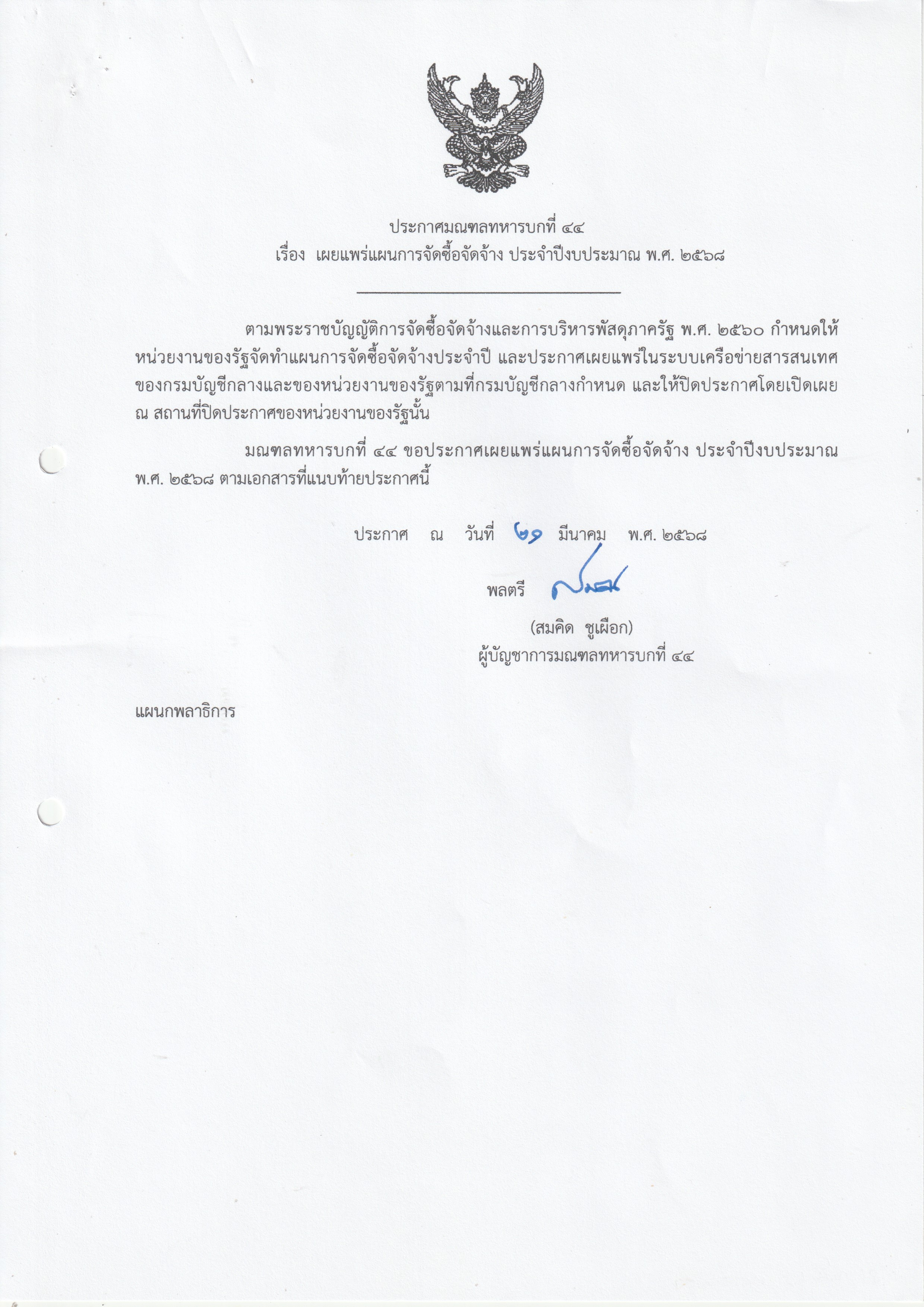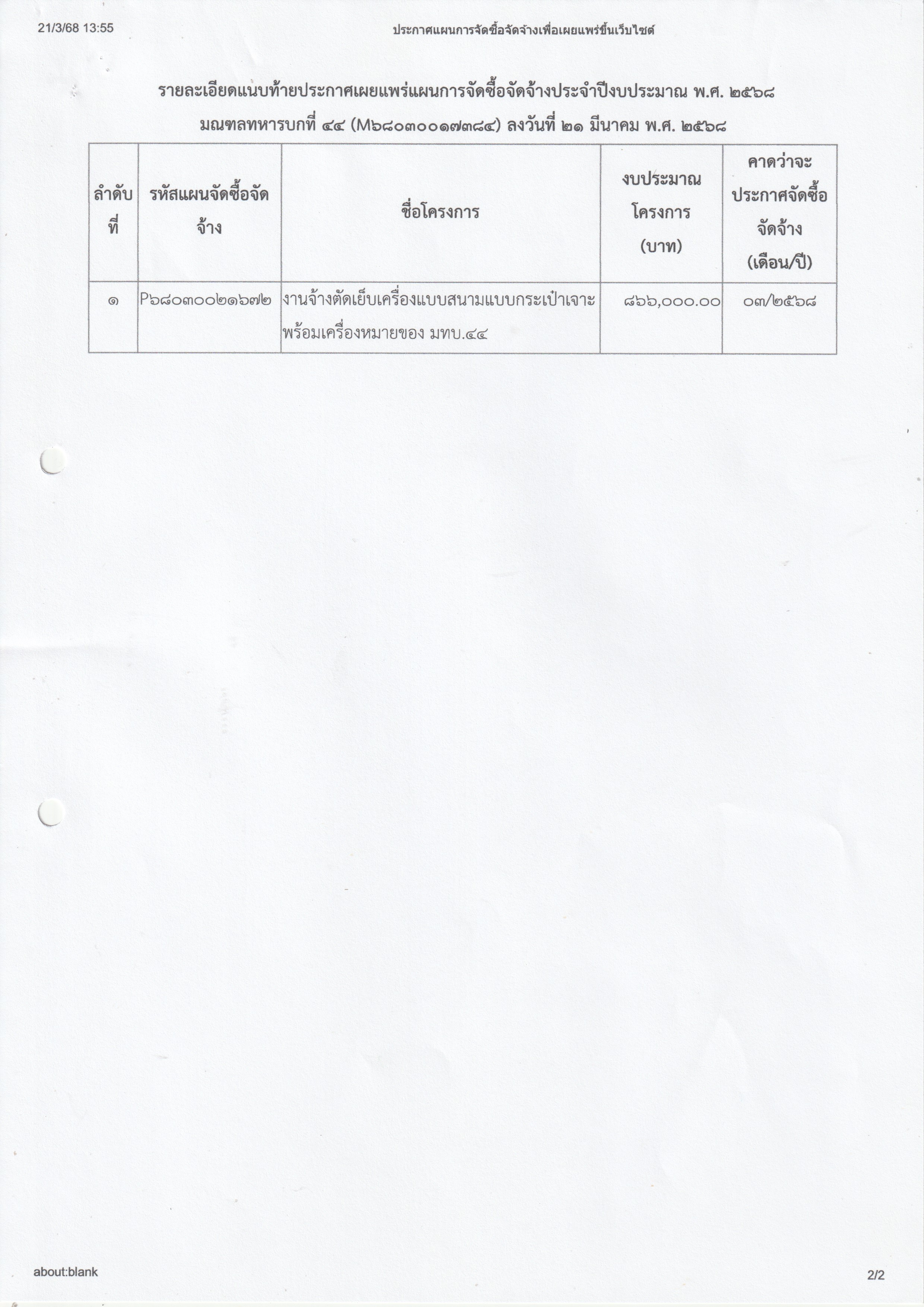 เผยแพร่แผนการจัดซื้อจัดจ้าง ประจำปีงบประมาณ พ.ศ. ๒๕๖๙ งานจ้างตัดเย็บเครื่องแบบสนามแบบกระเป๋าเจาะ พร้อมเครื่องหมายของทหารกองประจำการปีที่ 1 (ผลัด 1/2568) ของมณฑลทหารบกที่ 44
