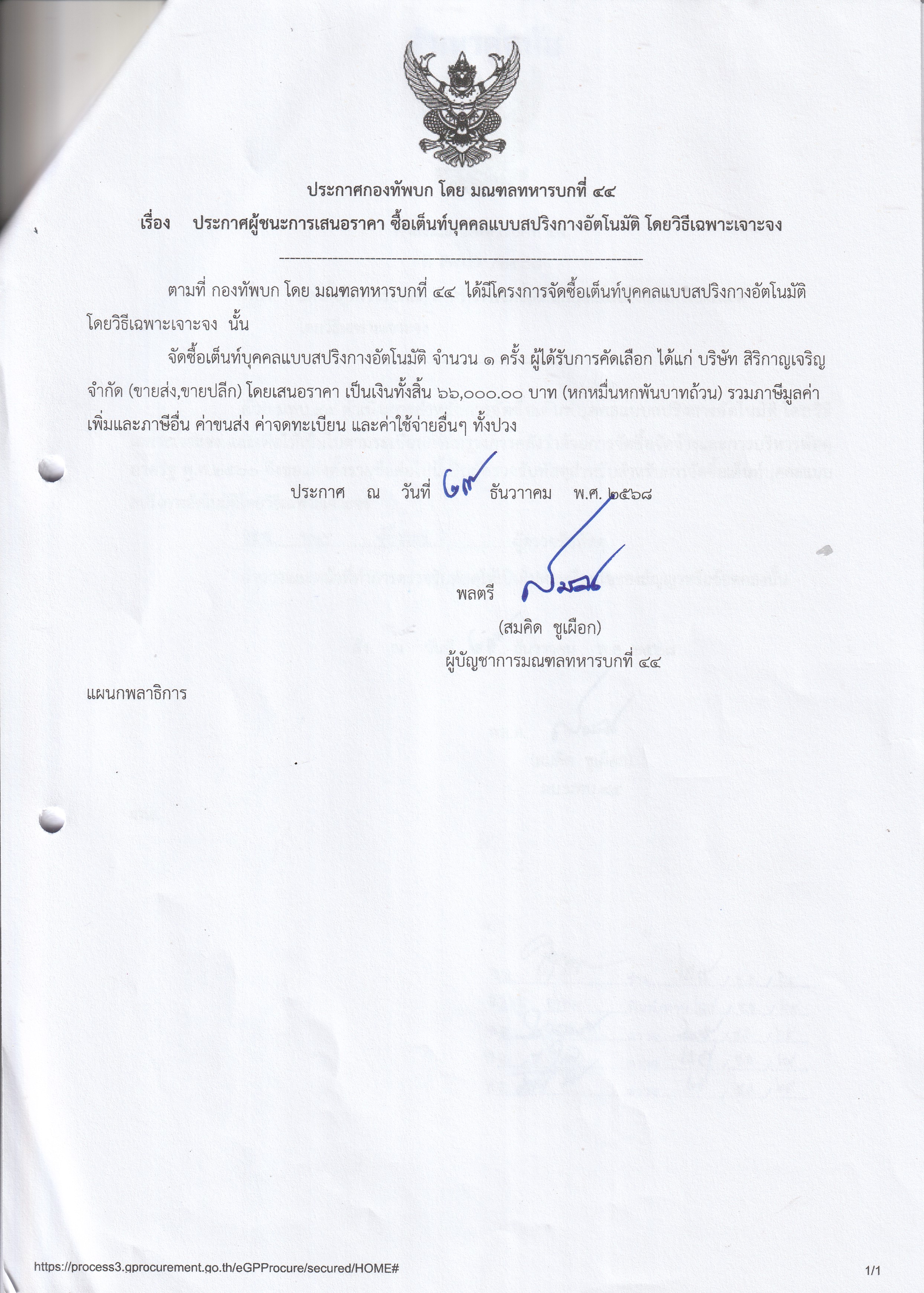 ประกาศผู้ชนะเสนอราคา จัดซื้อเต็นท์บุลคลแบบสริงกางอัติโนมัติ โดยวิธีเฉพาะเจาะจง