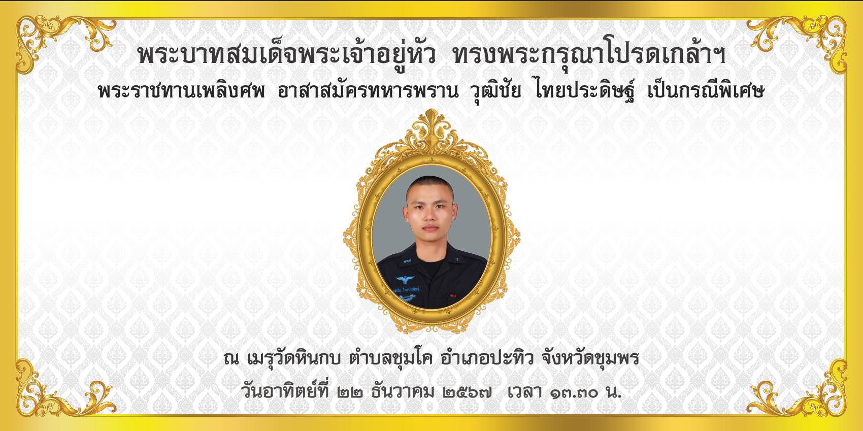 ซึ่งได้เสียชีวิตจากการปฏิบัติหน้าที่ในพื้นที่ 3 จชต.เมื่อ 12 ธ.ค.67,1100 จากเหตุคนร้ายลอบยิง ขณะปฏิบัติหน้าที่ ในพื้นที่บ้านปารีย์ หมู่ที่ 4 ต.จะแนะ อ.จะแนะ จว.น.ธ เป็น กรณีพิเศษ ณ เมรุวัดหินกบ ตำบลชุมโค อำเภอ ปะทิว จังหวัดชุมพร